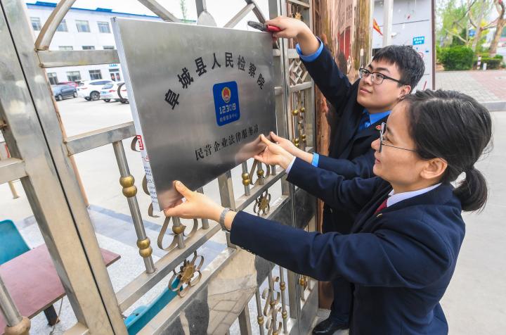 2019年4月23日,河北省阜城縣人民檢察院檢察官在一家企業(yè)門口掛“民營(yíng)企業(yè)法律服務(wù)站”的牌子,為經(jīng)濟(jì)發(fā)展履行保駕護(hù)航職責(zé)。新華社記者李曉果攝