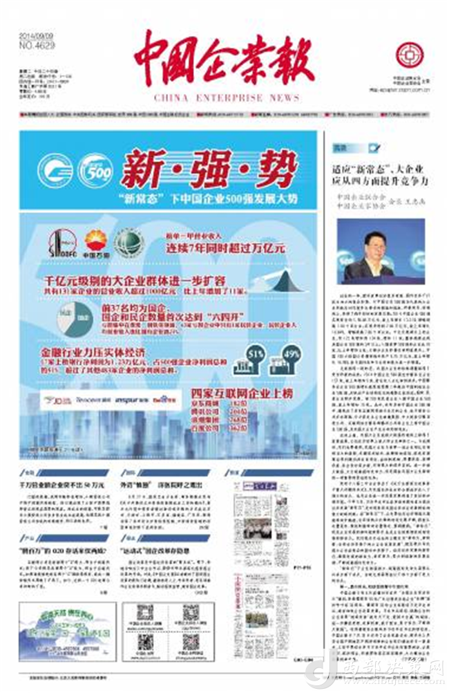 《中國(guó)企業(yè)報(bào)》是由中國(guó)企業(yè)聯(lián)合會(huì)、中國(guó)企業(yè)家協(xié)會(huì)主管主辦,是中國(guó)唯一以企業(yè)和企業(yè)家為報(bào)道核心的中央級(jí)媒體。《中國(guó)企業(yè)報(bào)》是一張專(zhuān)為中國(guó)企業(yè)創(chuàng)辦的報(bào)紙。1988年1月4日,由國(guó)家經(jīng)委主辦,中國(guó)企業(yè)管理協(xié)會(huì)承辦的《中國(guó)企業(yè)報(bào)》正式創(chuàng)刊。陳云同志為報(bào)紙題寫(xiě)了報(bào)頭,鄧力群任報(bào)社名譽(yù)顧問(wèn),袁寶華任報(bào)社名譽(yù)社長(zhǎng)。從1988年創(chuàng)辦至今,秉承“面向企業(yè),為企業(yè)服務(wù)”的辦報(bào)宗旨,親歷和記錄著中國(guó)企業(yè)的改革進(jìn)程,同時(shí)伴隨著中國(guó)企業(yè)的發(fā)展壯大而不斷成長(zhǎng)。經(jīng)過(guò)20多年的實(shí)踐探索,在報(bào)道企業(yè)新聞、推動(dòng)企業(yè)改革、維護(hù)企業(yè)權(quán)益、促進(jìn)企業(yè)發(fā)展等方面,逐步形成了自身的風(fēng)格和特色,專(zhuān)業(yè)性、權(quán)威性日益得到了企業(yè)界和新聞界的認(rèn)同。