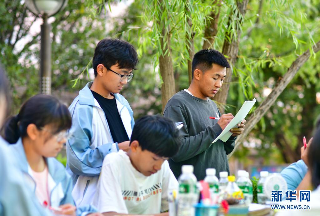 記者在這個(gè)特殊的“帳篷課堂”看到,學(xué)生們有的正在集中做著卷子,有的在復(fù)習(xí)課文,老師在一旁耐心講解。遠(yuǎn)處,空置的教學(xué)樓懸掛著條幅,上面寫著“用拼搏的汗水灌注無(wú)悔的高三路 考前不怕 考后不悔”。