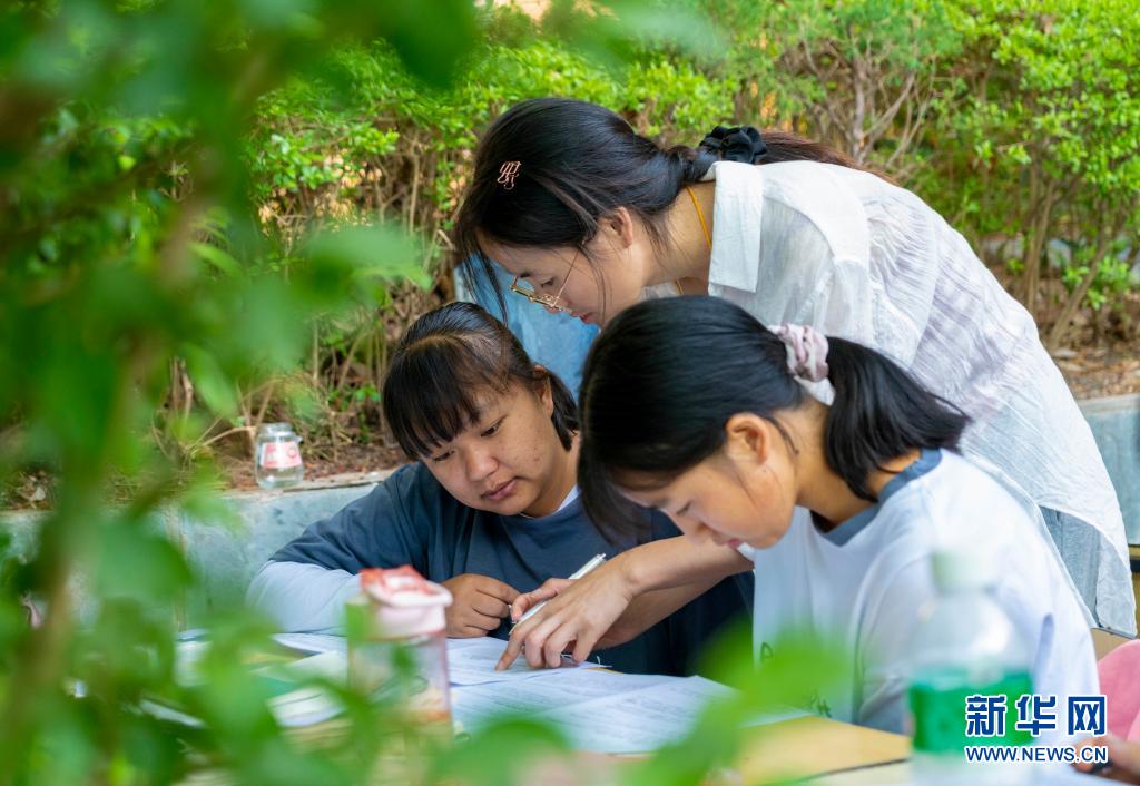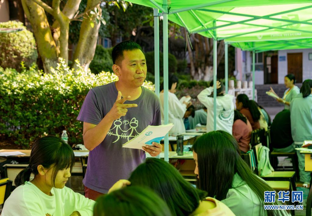 5月24日,漾濞一中老師(中)在輔導(dǎo)高三年級(jí)學(xué)生。新華社記者陳欣波攝