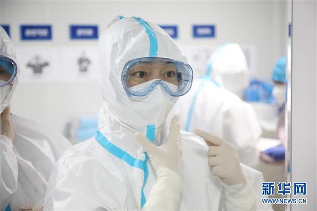 海軍軍醫(yī)大學(xué)第二附屬醫(yī)院急診、重癥醫(yī)學(xué)科護士長陳靜在武漢火神山醫(yī)院進入“紅區(qū)”前檢查防護服(3月25日攝)。新華社發(fā)(陳晨 攝)