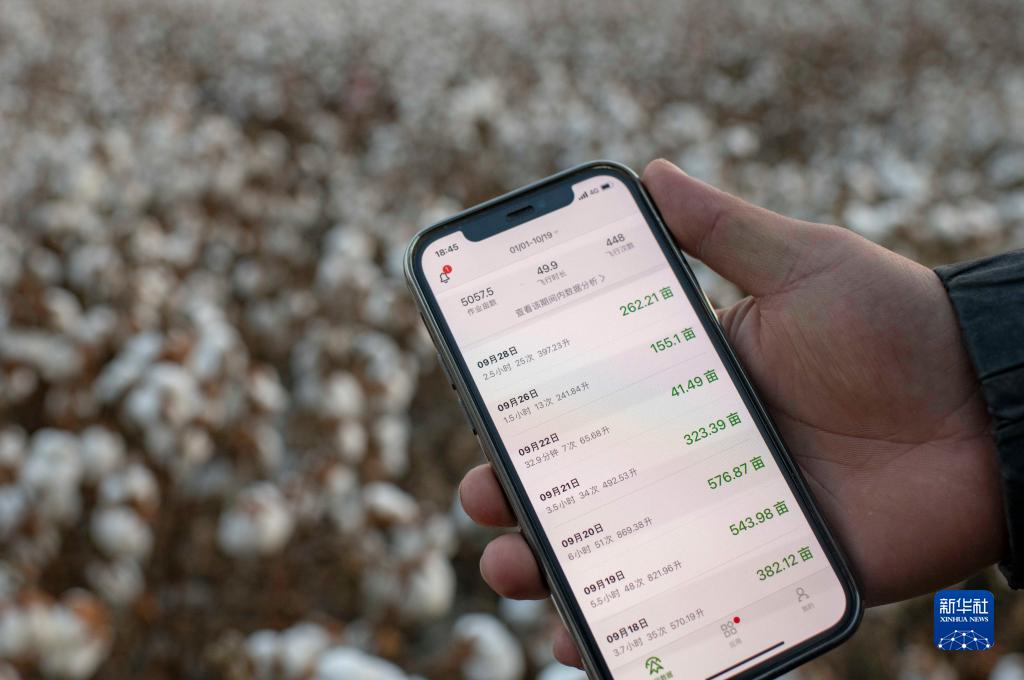 秋收時節(jié),陸德文展示自己使用無人機為自家和其他農戶棉田打落葉劑的飛行數(shù)據(jù)(10月19日攝)。在親身感受過無人機飛防作業(yè)的便捷后,老陸家在今年8月買了一臺。新華社記者 胡虎虎 攝