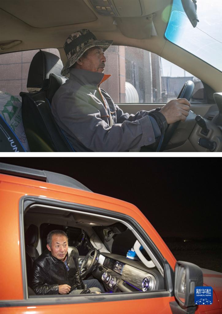 拼版照片:上圖為春播時節(jié),陸高林開車載著農資去棉田干活(4月15日攝);下圖為秋收時節(jié),陸高林在新?lián)Q的越野車內等候采棉機轉場(10月22日攝)。新華社記者 胡虎虎 攝