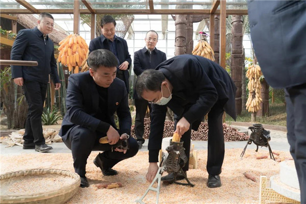 在上古農(nóng)耕文化、現(xiàn)代農(nóng)業(yè)科技與地方特色農(nóng)業(yè)相結(jié)合的神農(nóng)百草園里,高廳長饒有興趣的親自體驗(yàn)農(nóng)事活動的玉米脫粒。調(diào)研組一行還參觀了各項(xiàng)高科技栽培種植及研學(xué)課堂區(qū)域。