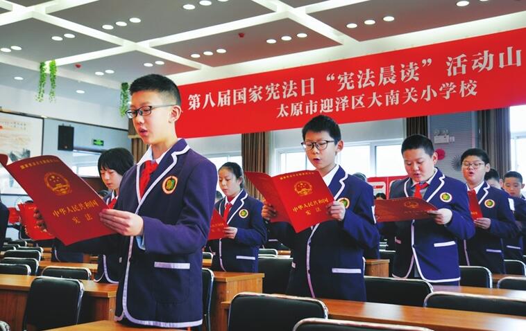 12月3日,迎澤區(qū)大南關(guān)小學(xué)開展“憲法晨讀”活動。該校作為第八屆國家憲法日“憲法晨讀”山西分會場,通過讓學(xué)生們朗讀憲法、收看直播等方式宣傳憲法知識。(徐浩軒 攝)