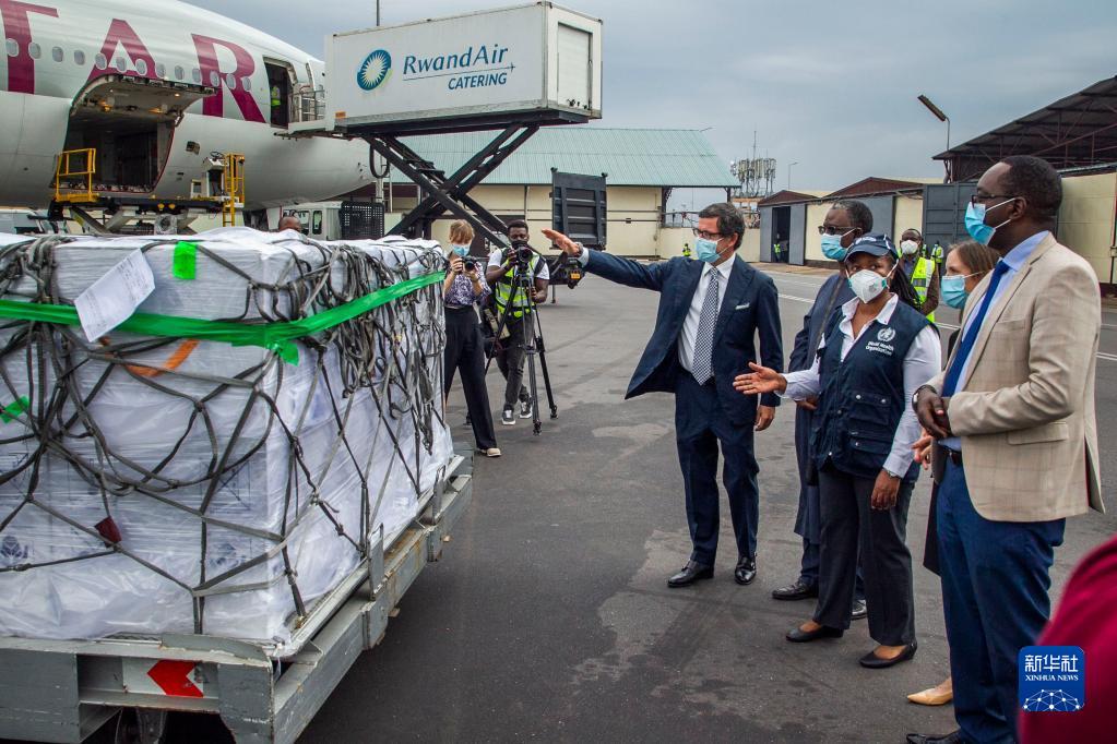 盧旺達(dá)衛(wèi)生部長達(dá)尼埃爾·恩加米杰(右一)等官員在基加利國際機(jī)場(chǎng)查看該國首批通過COVAX計(jì)劃收到的新冠疫苗(2021年3月3日)。新華社發(fā)(西里爾·恩德格亞攝)