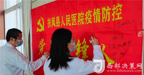 為全力做好汽車站疫情防控工作,院黨總支向全院黨員發(fā)出動(dòng)員倡議書,職能、臨床內(nèi)科、臨床外科和醫(yī)技黨支部迅速響應(yīng),積極動(dòng)員。11月23日下午,全體黨員在院多功能廳面對(duì)黨旗莊嚴(yán)宣誓:“自愿加入疫情防控黨員先鋒隊(duì),堅(jiān)決以行動(dòng)譜寫忠誠(chéng),用實(shí)干詮釋擔(dān)當(dāng),堅(jiān)守崗位,盡職盡責(zé),不畏懼、不退縮、不計(jì)得失,全力以赴阻擊疫情,守護(hù)人民群眾的生命健康”。隨后,院黨總支書記、院長(zhǎng)馬忠科,副書記、副院長(zhǎng)蘇長(zhǎng)岐,支委委員王文輝、趙軒弘、張軍強(qiáng)、陳文博等院領(lǐng)導(dǎo)帶頭在先鋒隊(duì)隊(duì)旗上簽名許下了“愛的諾言”。