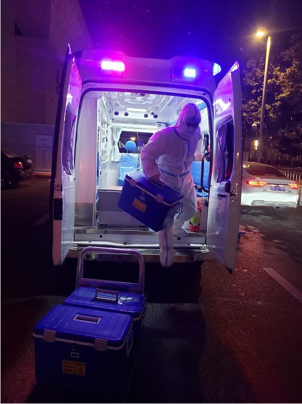 片刻休整后,劉鵬飛和隊員們又驅(qū)車投入轉(zhuǎn)運核酸檢測樣本的任務(wù)……