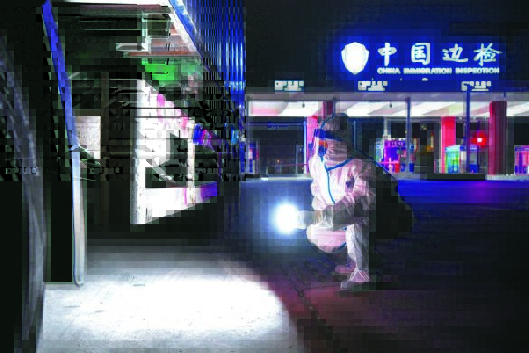 27日,記者在東興高速路口楠木山邊境檢查站看到,廣西防城港邊境管理支隊(duì)的執(zhí)勤民警身穿防護(hù)服,有條不紊地對(duì)車輛人員進(jìn)行檢查,引導(dǎo)運(yùn)送抗疫物資和人員的車輛有序進(jìn)入檢查站。