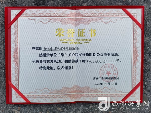 西安市新城區(qū)慈善協(xié)會向陜建基礎(chǔ)集團頒發(fā)支持公益事業(yè)發(fā)展,積極參與慈善活動的榮譽證書。