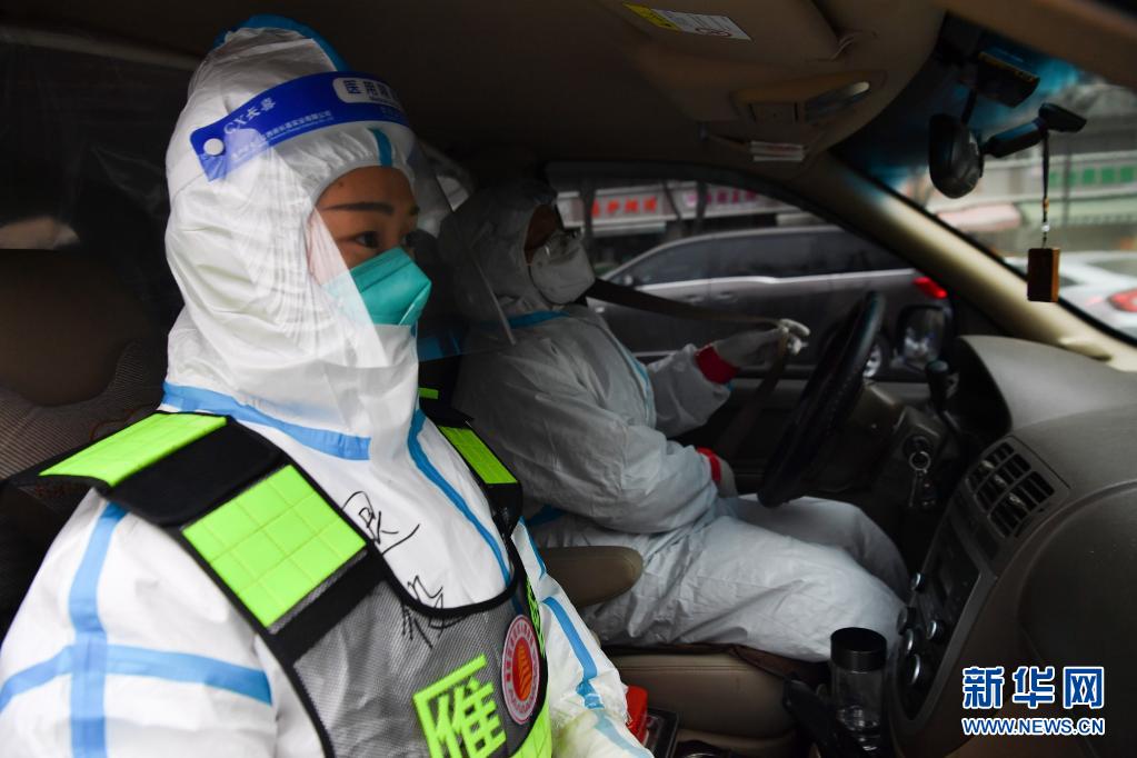退役軍人志愿突擊隊(duì)隊(duì)員(左)準(zhǔn)備出發(fā)轉(zhuǎn)運(yùn)核酸檢測(cè)樣本。新華社記者 張博文 攝