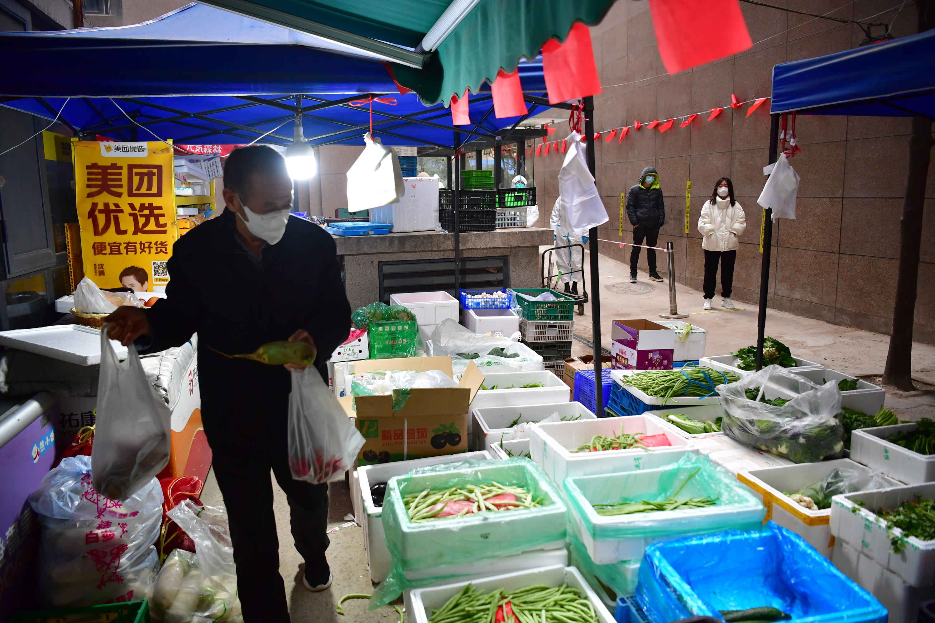 1月7日,居民在陜西西安曲江新區(qū)一小區(qū)便利店外選購菜品。新華社記者邵瑞 攝
