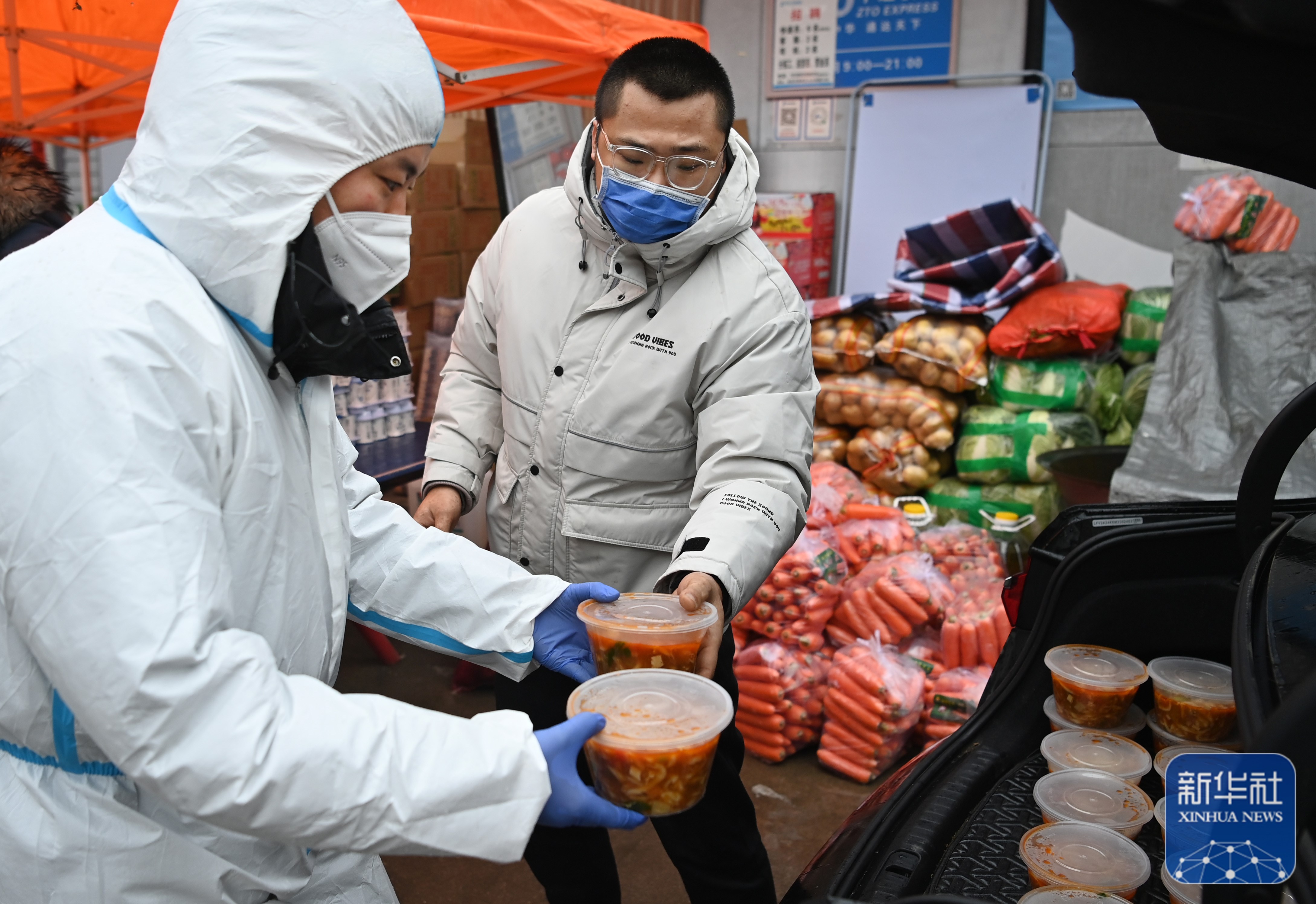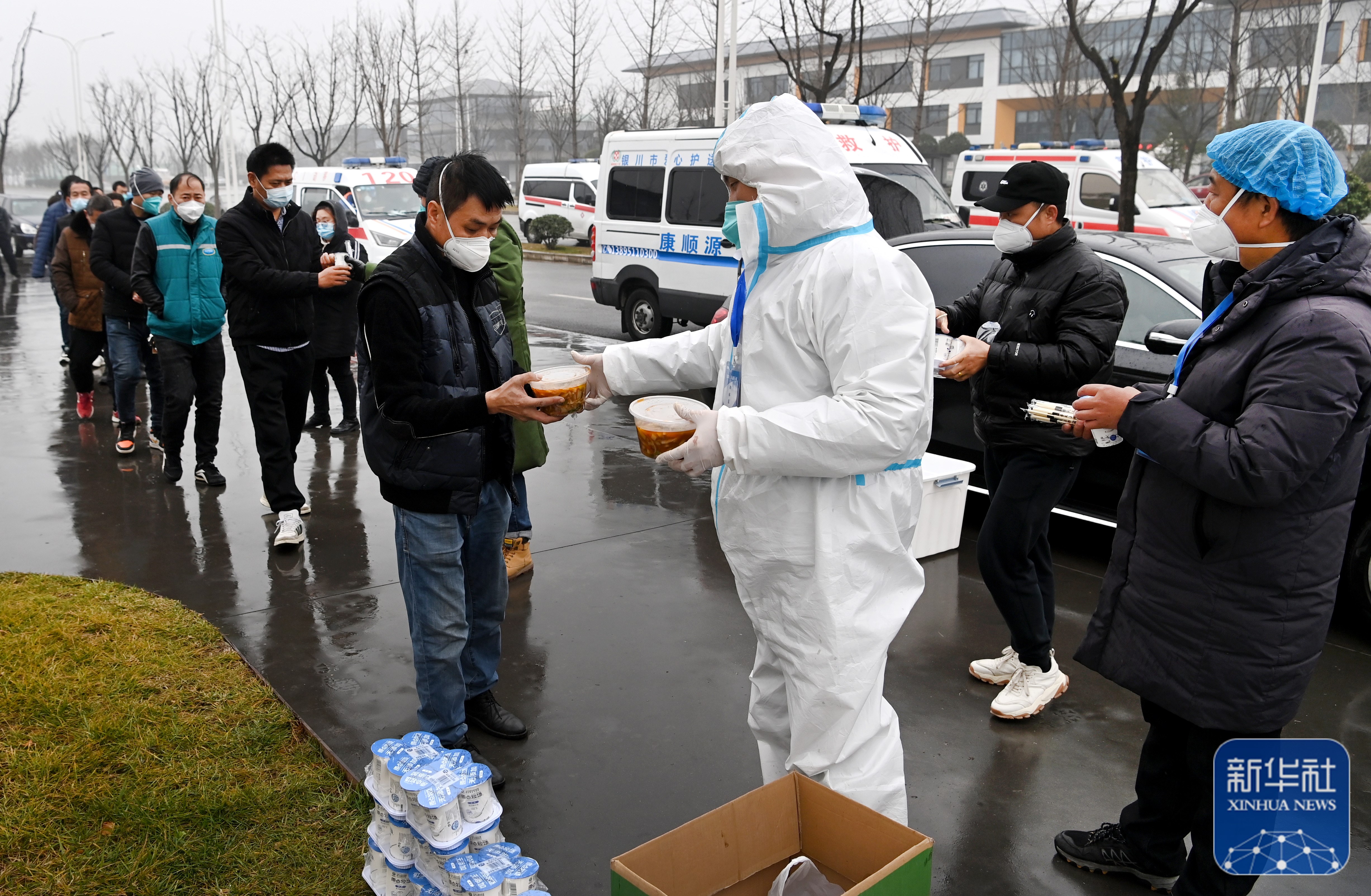 1月8日,志愿者(右三)在為防疫一線人員發(fā)放“愛心餐”。