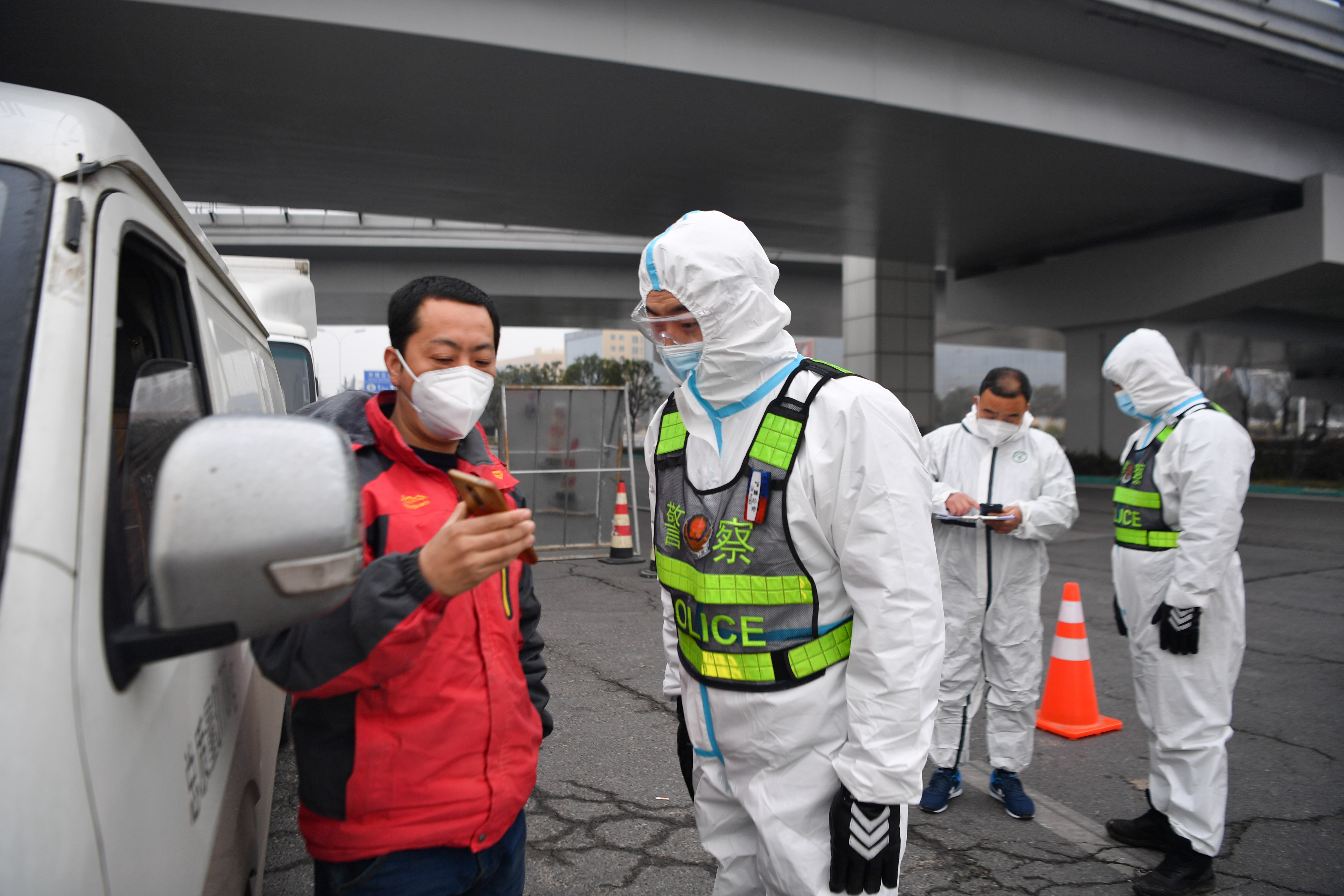 1月10日,西安市公安局浐灞生態(tài)區(qū)分局民警在西安市繞城高速新筑收費站查驗駕駛員健康碼。新華社記者 張博文 攝