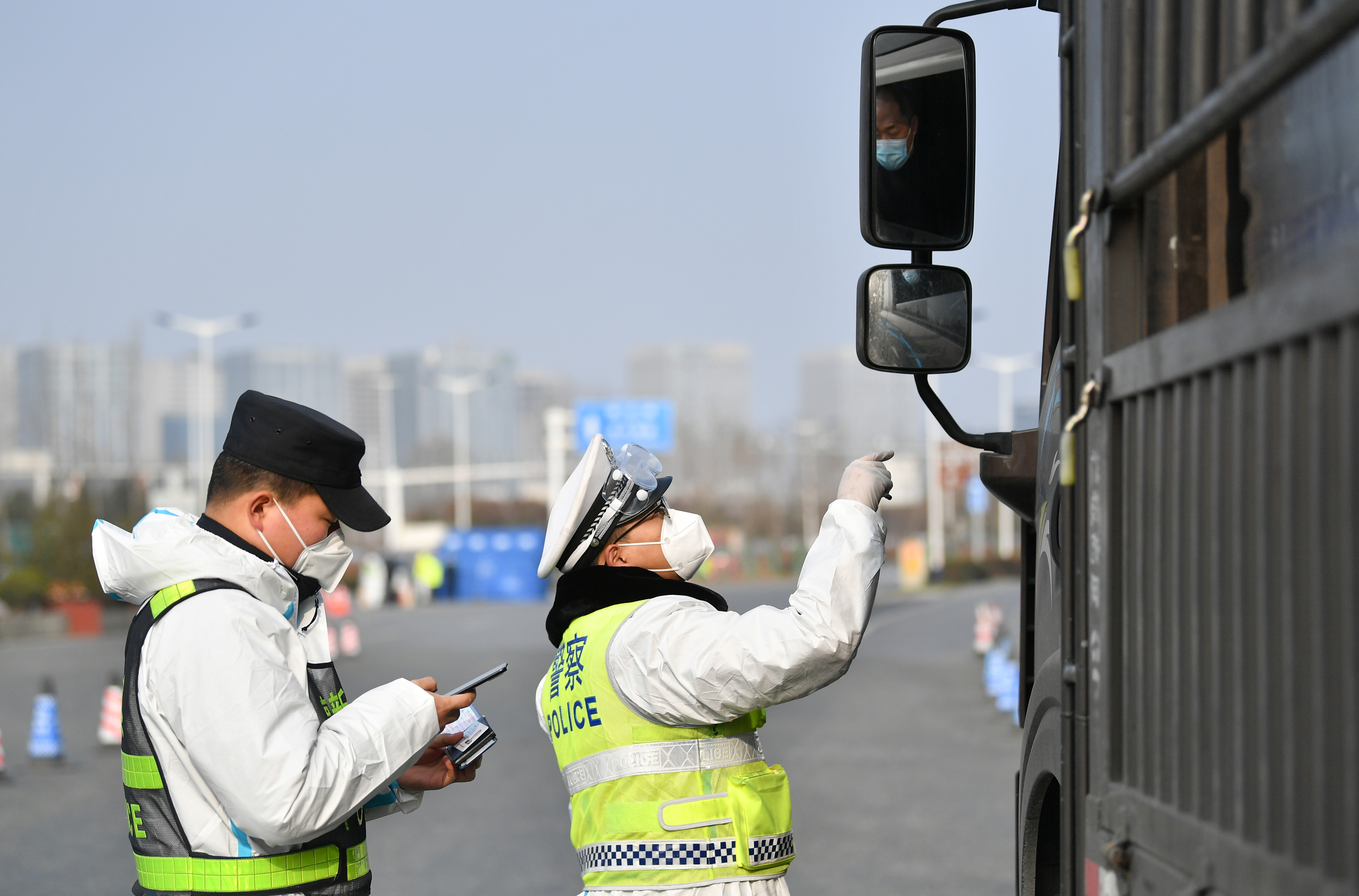 1月10日,西安市公安局浐灞生態(tài)區(qū)分局民警在西安市繞城高速新筑收費站查驗車輛通行證件。新華社記者 張博文 攝