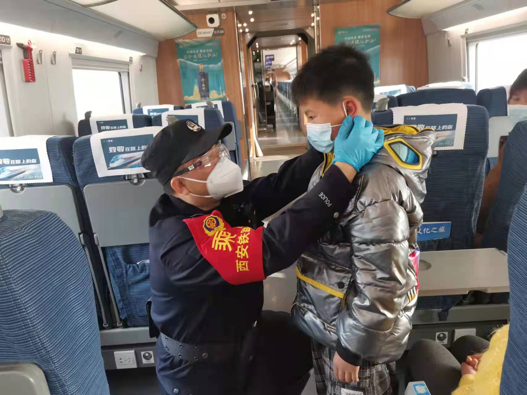 圖為乘警趙英斌在高鐵上教小朋友正確佩戴口罩(受訪者供圖)