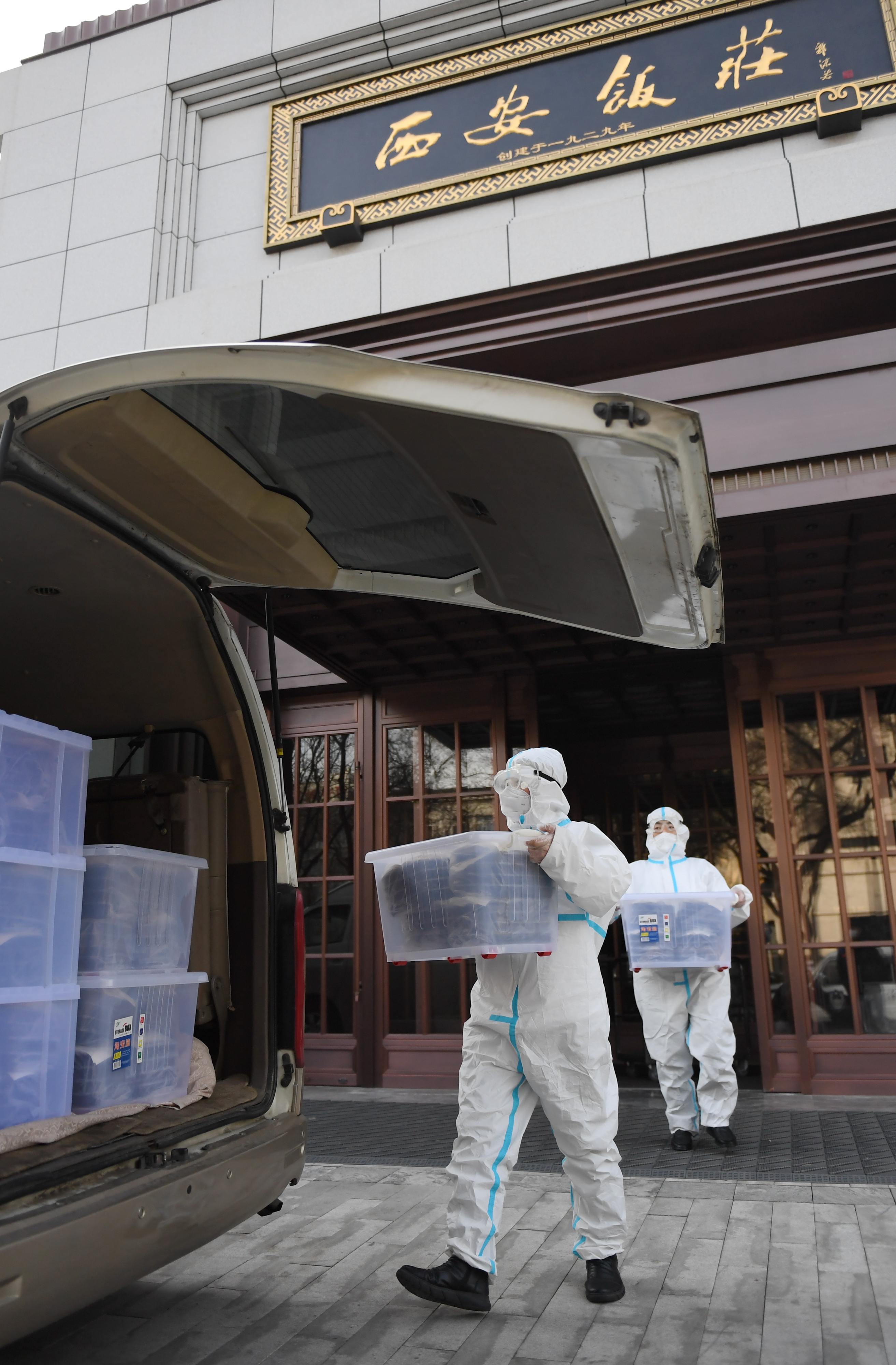 西安飯莊東大街總店工作人員正將打包好的餐食裝車。新華社記者 李一博 攝