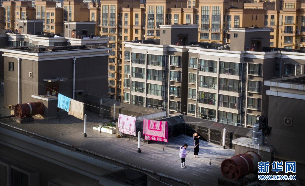 1月13日,西安市一小區(qū)居民在樓頂上休閑鍛煉(無人機照片)。新華社記者 陶明 攝