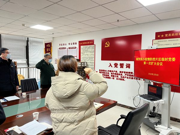 2022年1月6日,商貿(mào)園辦疫情防控片區(qū)臨時黨委在第一次擴(kuò)大會議上重溫入黨誓詞。浐灞融媒體中心供圖