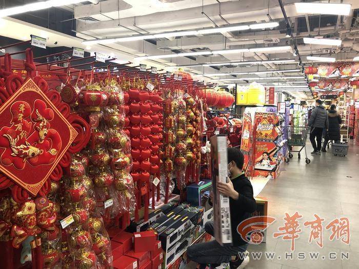 記者體驗(yàn)了一下,超市嚴(yán)格落實(shí)防疫要求,顧客掃碼,憑綠碼進(jìn)入。超市門(mén)口,有燈籠、“福”字等年貨。超市播著過(guò)年喜慶的音樂(lè),貨物齊全,市民們?cè)谟行蛸?gòu)物,工作人員正在給部分貨物加貨。