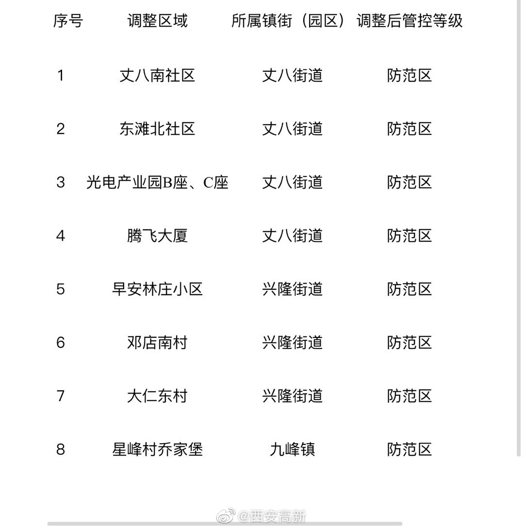 按照國務(wù)院聯(lián)防聯(lián)控機(jī)制和省、市關(guān)于新冠肺炎疫情社區(qū)防控工作要求,結(jié)合西安高新區(qū)疫情防控形勢,經(jīng)高新區(qū)新冠肺炎疫情防控指揮部研判,報(bào)市疫情防控指揮部備案同意,決定自2022年1月23日起,對部分區(qū)域進(jìn)行調(diào)整管理,具體如下:將丈八街道丈八南社區(qū)等3個(gè)鎮(zhèn)街的8個(gè)小區(qū)村、樓棟調(diào)整為防范區(qū)(具體名單見下表)。