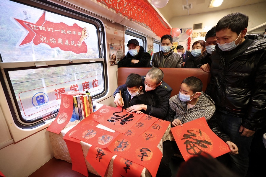 列車工作人員為旅客寫春聯(lián)(央廣網(wǎng)發(fā) 劉松霖攝)