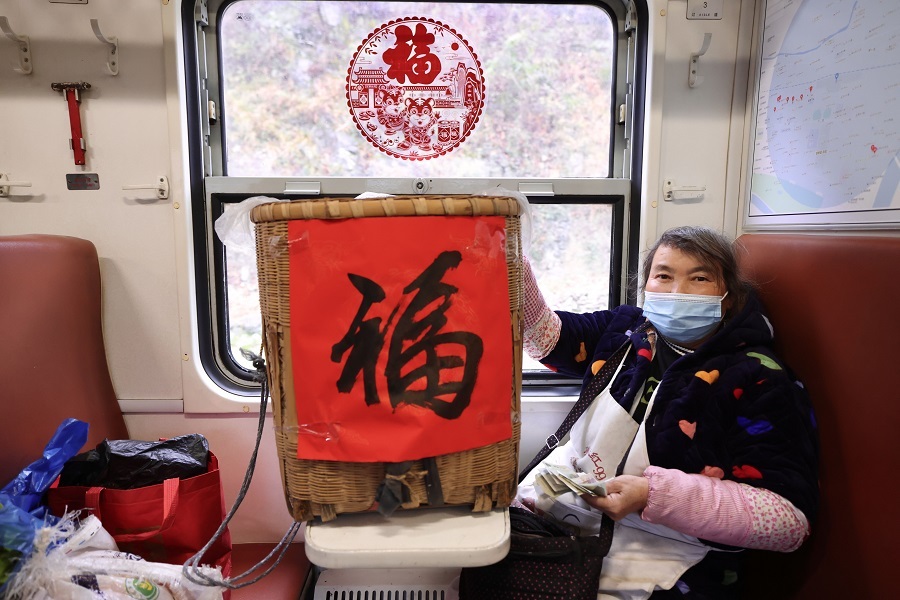 “各位老鄉(xiāng),早上好,今天是農(nóng)歷小年,我們將舉行送祝福活動。”列車員衛(wèi)進忠的話音剛落,就看見車廂里老鄉(xiāng)們急忙圍攏過來。他把寫好的春聯(lián)送給身邊背著背簍的一位老人,將一張福字貼在了背簍上。拿到對聯(lián)、福字的老人滿臉笑容,連忙道謝。“火車快開, 別讓我等待,火車快開,請你趕快送我到遠方家鄉(xiāng)……”在與旅客互動中,列車員李愛民激情演唱歌曲《火車快開》,送去列車工作人員的新春祝福,引來旅客們陣陣掌聲。