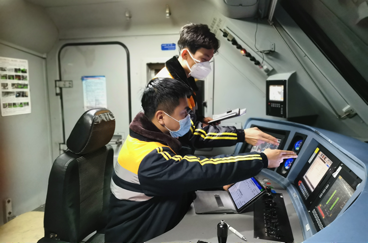 劉柯和師傅確認(rèn)列車運行參數(shù)。