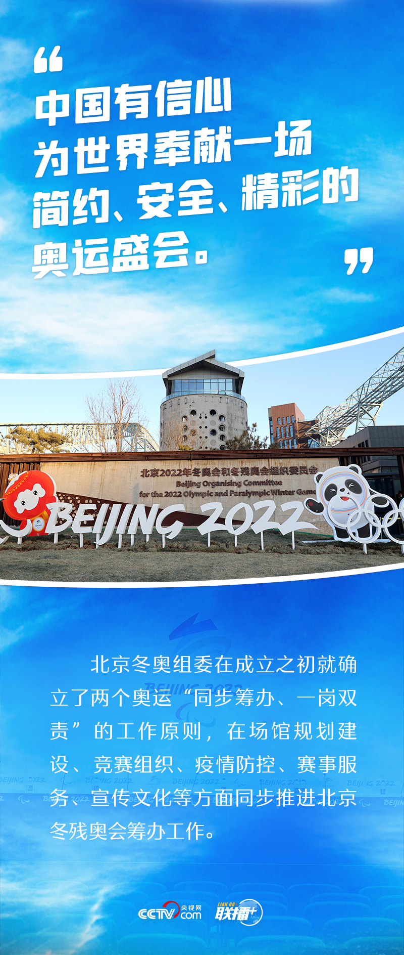 “兩個奧運,同樣精彩”,這是中國的莊嚴(yán)承諾。2015年夏天,北京攜手張家口獲得2022年冬奧會和冬殘奧會舉辦權(quán)。此后六年多,北京冬奧組委始終堅持兩個奧運“同步籌辦、一崗雙責(zé)”的工作原則,在場館規(guī)劃建設(shè)、競賽組織、疫情防控、賽事服務(wù)、宣傳文化等方面積極推進籌辦工作,努力為廣大運動員提供一流的競賽場地和賽事服務(wù),創(chuàng)造良好的參賽體驗和參賽環(huán)境。