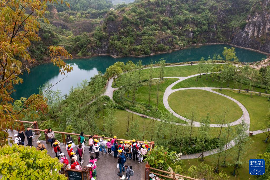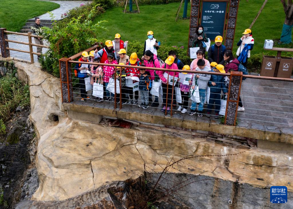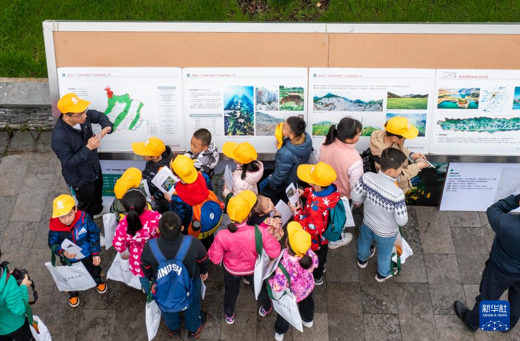 4月17日,參加活動的中小學(xué)生在地質(zhì)專業(yè)工作人員的帶領(lǐng)下,對銅鑼山礦山公園的地質(zhì)遺跡和生態(tài)修復(fù)進(jìn)行科學(xué)考察(無人機(jī)照片)。