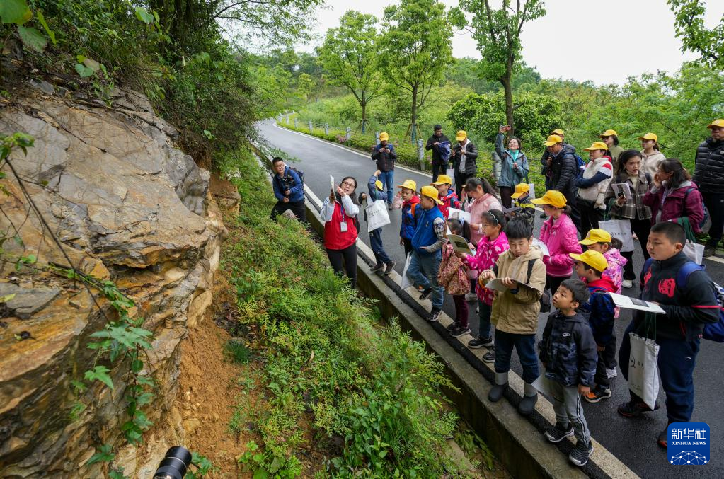 4月17日,參加活動的地學(xué)旅游愛好者、中小學(xué)生和部分媒體工作者,在地質(zhì)專業(yè)工作人員的帶領(lǐng)下進(jìn)行銅鑼山科學(xué)考察。