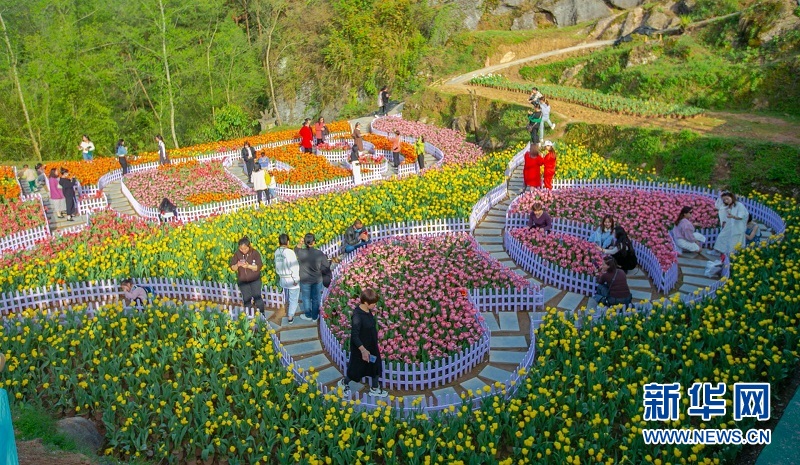圖為在湖北來鳳縣檀木灣村萬余株郁金香競相綻放,吸引游客前來踏春賞花,“花海經(jīng)濟(jì)”助力村民增收致富。