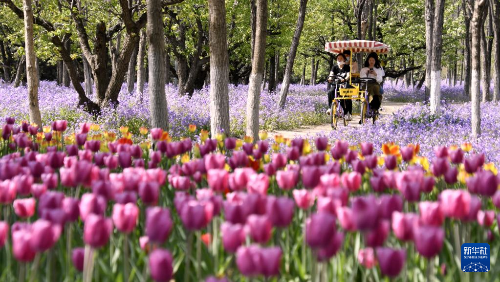 4月19日,游人在北臧村鎮(zhèn)永定河畔的綠色港灣林間賞花。