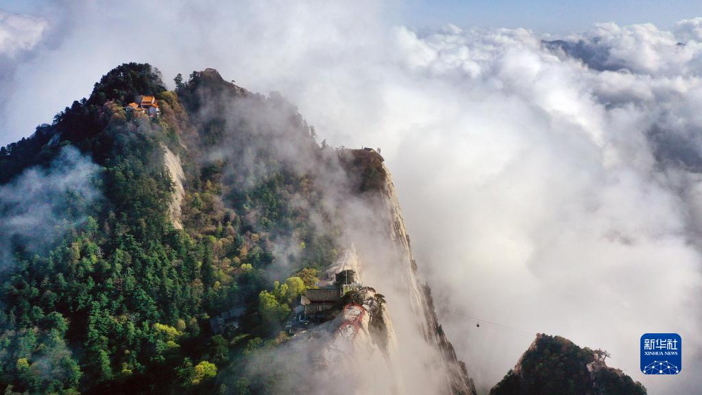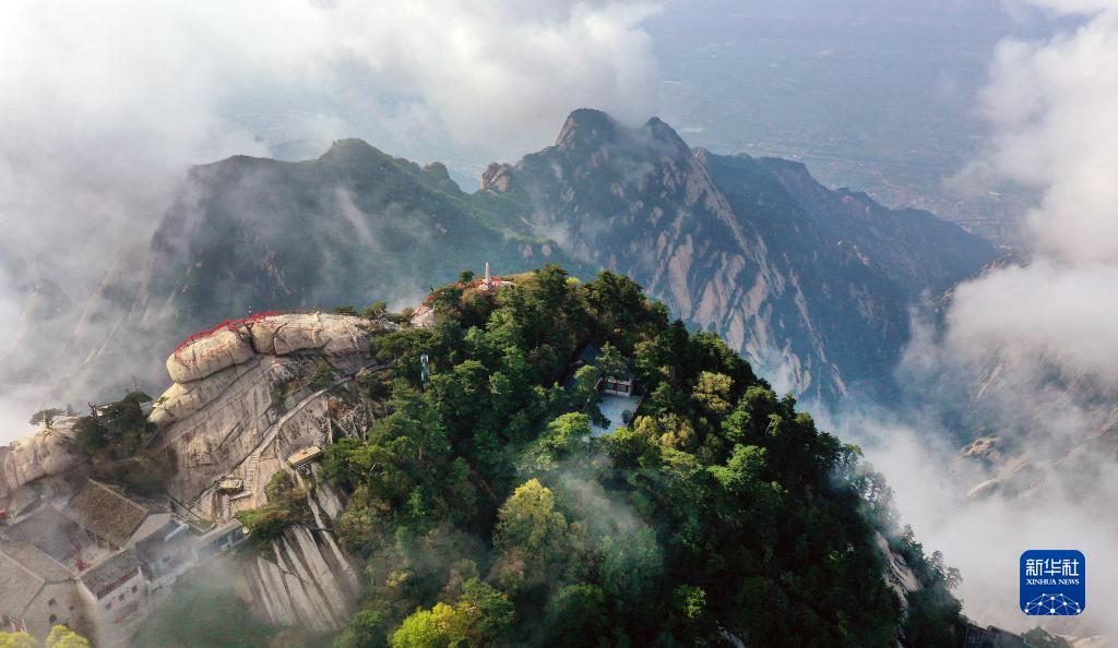 云霧中的華山西峰(4月28日攝,無人機(jī)照片)。新華社記者陶明攝