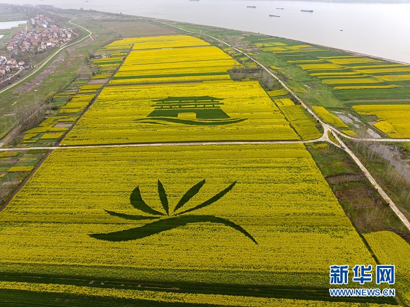 鄂州湖北現(xiàn)代農(nóng)業(yè)科技創(chuàng)新與集成示范基地。從空中俯瞰,大片大片金黃的油菜花田里,鑲嵌著由一片綠色植物組成的圖案,綠黃分明,映襯出“鄂州基地”“中國(guó)飯碗”幾個(gè)大字。