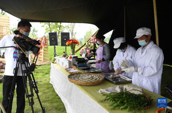 5月15日,肥西縣柿樹崗鄉(xiāng)村民通過“云上”直播制作當(dāng)?shù)孛朗齿镒郁昔?。新華社記者劉軍喜攝