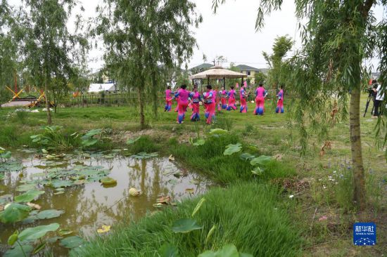 5月15日,肥西縣柿樹崗鄉(xiāng)村民通過“云上”直播表演當(dāng)?shù)貍鹘y(tǒng)非遺文化項(xiàng)目蓮湘舞。新華社記者劉軍喜攝