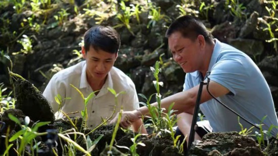 施茶村黨委書(shū)記洪義乾(右)查看火山石斛長(zhǎng)勢(shì)。受訪者供圖