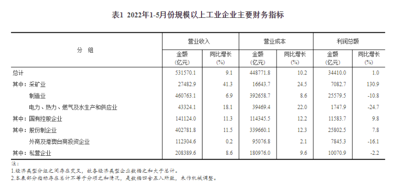 表1 2022年1-5月份規(guī)模以上工業(yè)企業(yè)主要財務指標