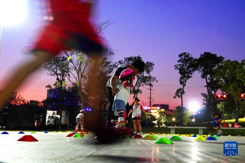 8月2日,在廣西南寧市明月湖濕地公園,孩子們在教練的指導(dǎo)下進(jìn)行輪滑訓(xùn)練。新華社發(fā)(喻湘泉攝)