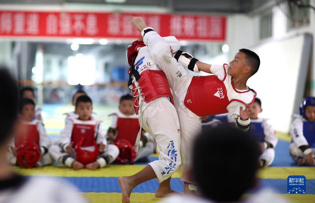 8月3日,孩子們在貴州省黔東南苗族侗族自治州丹寨縣一家跆拳道館練習(xí)跆拳道。新華社發(fā)(黃曉海 攝)