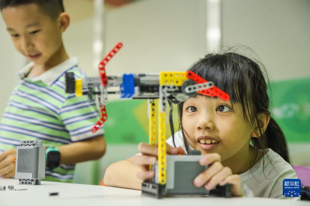 8月2日,在湖南省永州市藍(lán)山縣一培訓(xùn)學(xué)校,孩子們在體驗(yàn)機(jī)器人編程。新華社發(fā)(彭華攝)