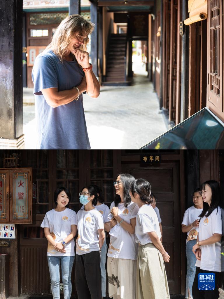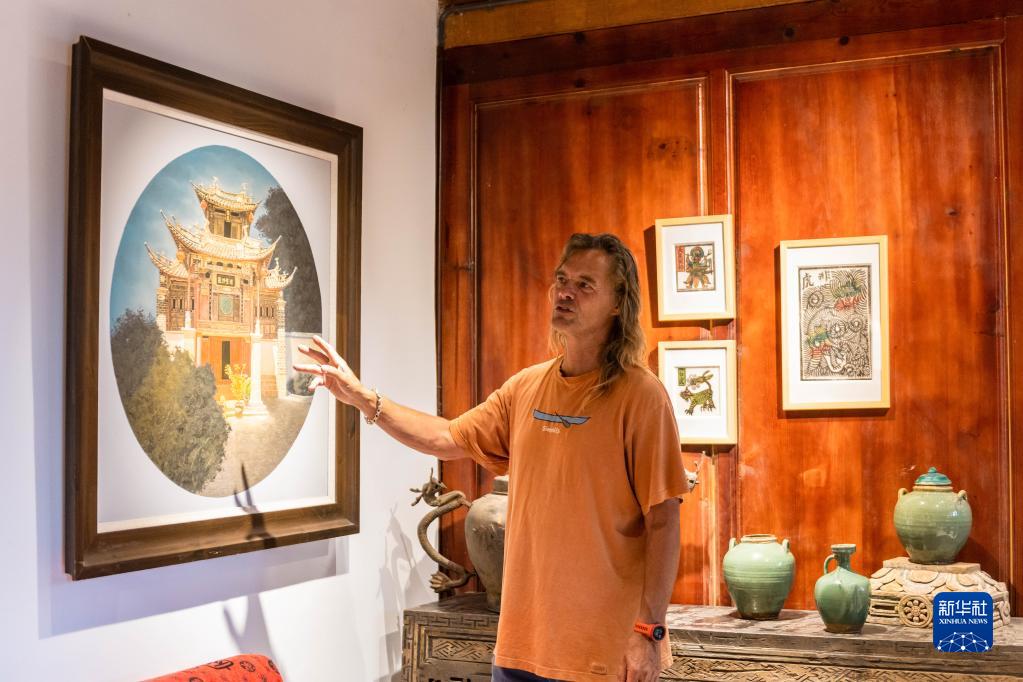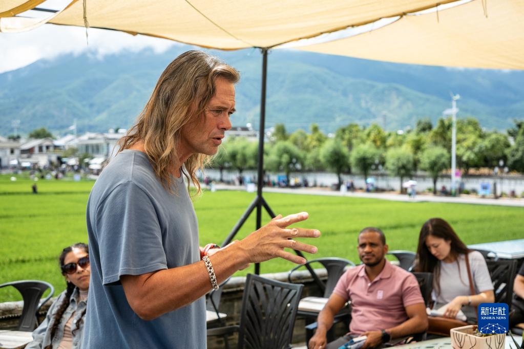 8月27日,林登在喜洲古鎮(zhèn)喜林苑向外國訪客介紹當(dāng)?shù)匚幕P氯A社記者 曹夢瑤 攝