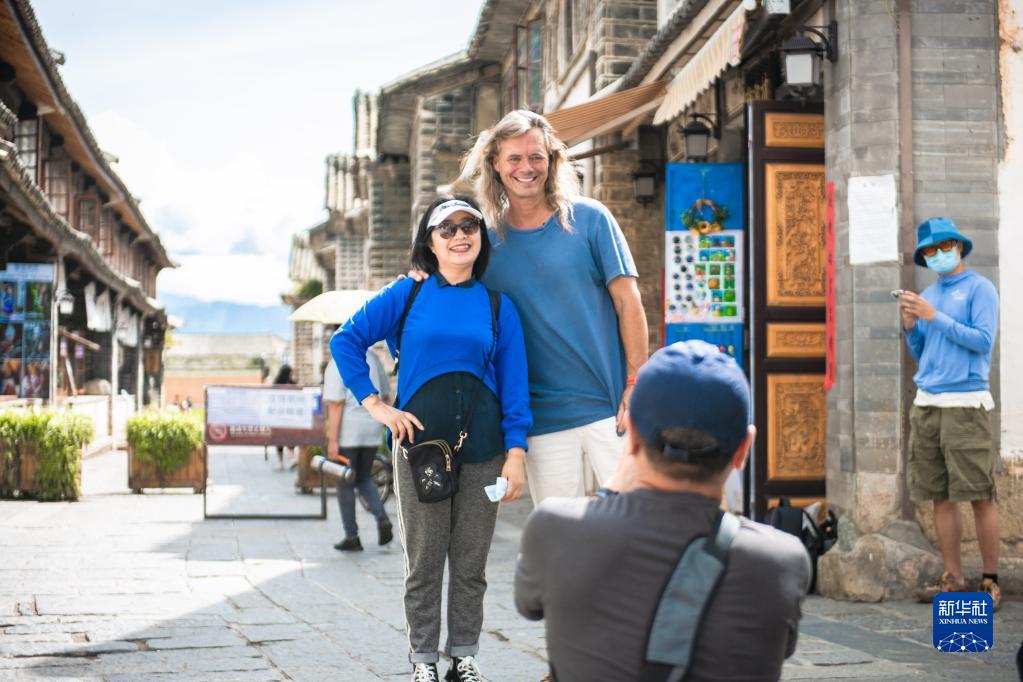 8月28日,林登在喜洲古鎮(zhèn)與游客合照。新華社記者 曹夢瑤 攝