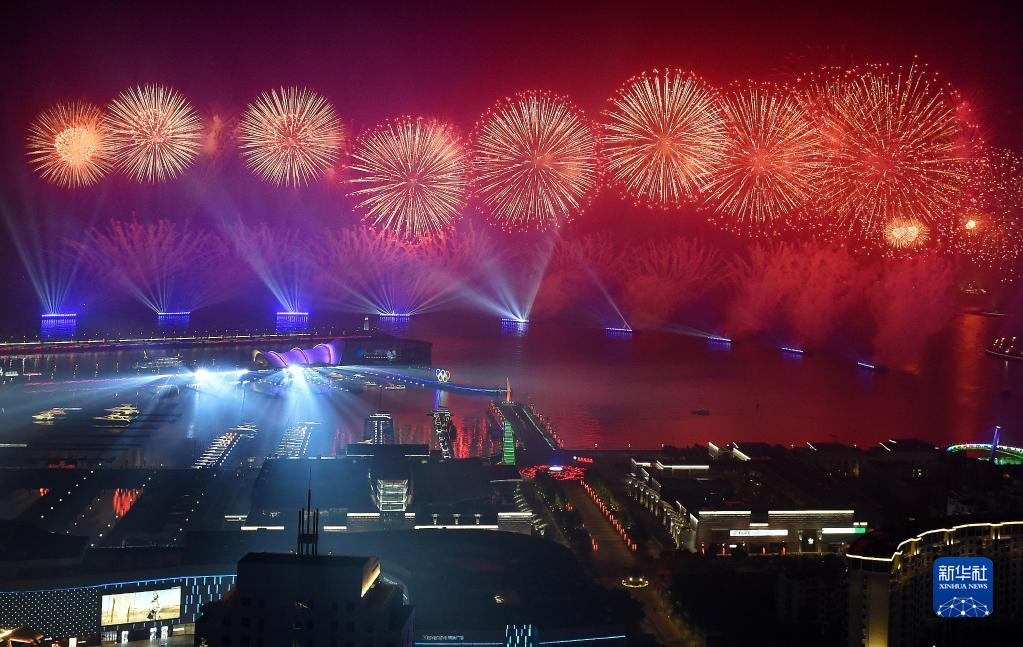 這是在青島舉行的《有朋自遠方來》燈光焰火藝術(shù)表演(2018年6月9日晚攝)。2018年6月9日至10日,上海合作組織成員國元首理事會第十八次會議在青島召開。新華社記者 李紫恒 攝