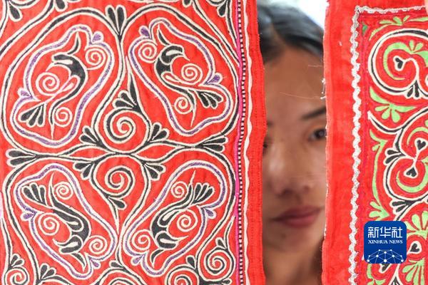 村民在貴州省黔西市新仁苗族鄉(xiāng)化屋村刺繡車間內查看苗繡成品(2022年6月1日攝)。新華社記者 歐東衢 攝