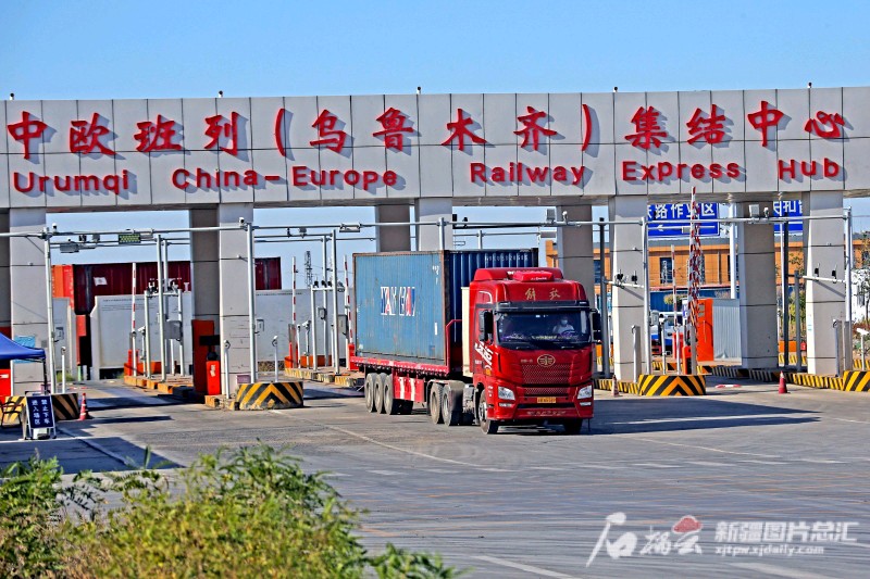 7月14日,一臺卡車從烏魯木齊國際陸港區(qū)中歐班列(烏魯木齊)集結(jié)中心駛出(資料圖片)。 石榴云/新疆日報記者 蔡增樂攝