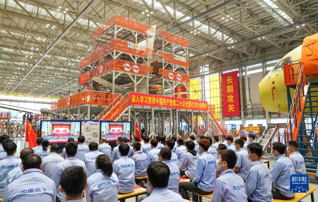 10月16日,在中國(guó)商飛上海飛機(jī)制造有限公司總裝車間,員工們?cè)谑湛粗袊?guó)共產(chǎn)黨第二十次全國(guó)代表大會(huì)開(kāi)幕會(huì)。新華社記者 丁汀 攝