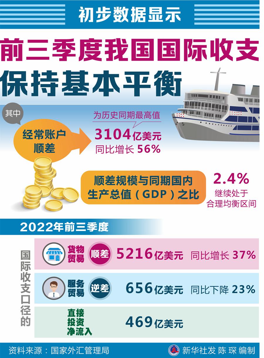 國(guó)家外匯管理局4日發(fā)布國(guó)際收支平衡表初步數(shù)據(jù)顯示,2022年前三季度,我國(guó)國(guó)際收支保持基本平衡。