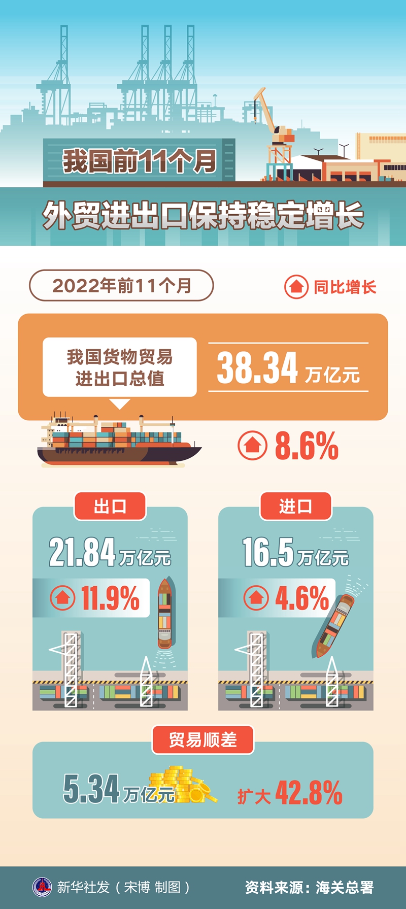 海關(guān)總署7日發(fā)布數(shù)據(jù):今年前11個(gè)月,我國貨物貿(mào)易進(jìn)出口總值38.34萬億元,同比增長8.6%。其中,出口21.84萬億元,增長11.9%;進(jìn)口16.5萬億元,增長4.6%;貿(mào)易順差5.34萬億元,擴(kuò)大42.8%。